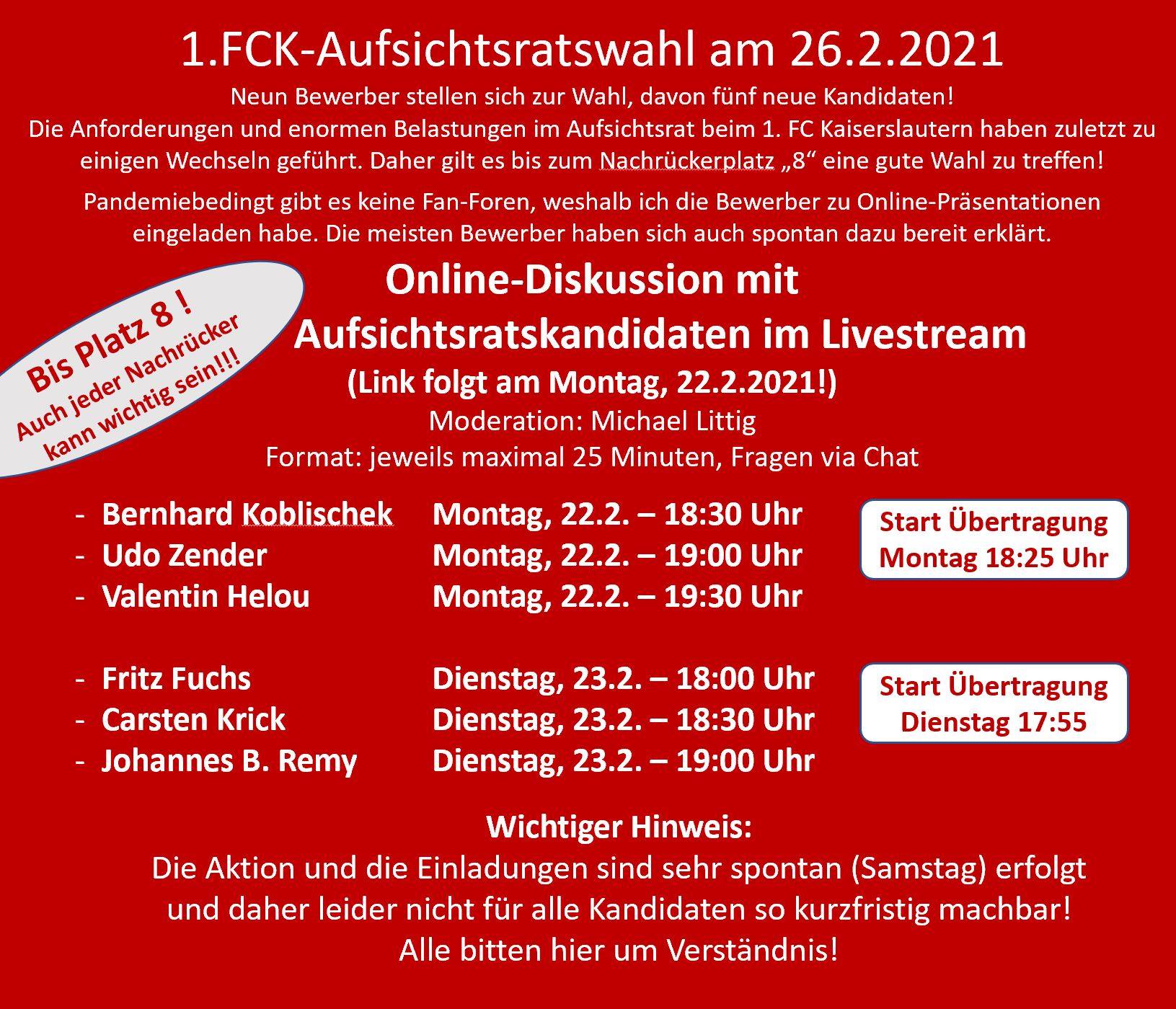 "Wegen "Corona" gibt es keine Fan-Foren und somit keine Gelegenheit zum Dialog mit den Aufsichtsratsbewerbern. Daher schalte ich hier einen Livestream. Die Zuschauer können via Chat/Kommentar Fragen an die Kandidaten stellen", beschreibt das frühere Aufsichtratsmitglied Michael Littig sein Vorhaben. In diesem Live-Meeting erhalten alle neun Kandidaten (Andreas Nicolay hat seine Kandidatur in der Zwischenzeit zurückgezogen) die Möglichkeit, sich einerseits persönlich vorzustellen und anderseits den Fragen der teilnehmenden Mitglieder und Fans zu stellen. Jeder Kandidat erhält dafür bis zu 25 Minuten. Die Fragen können via Facebook eingereicht, dort wieder der Livestream auch für alle interessierten FCK-Anhänger zugänglich sein (der Link folgt noch).
