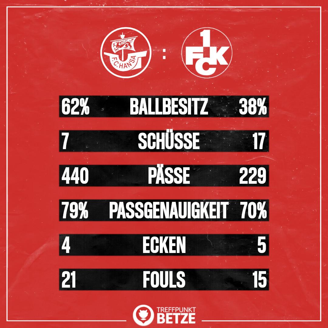 In der ersten Hälfte hat der Gastgeber aus Rostock genau eine Torchance: Verteidiger Damian Roßbach kommt zehn Meter vor dem FCK-Tor frei zum Kopfball, der jedoch relativ ungefährlich in den Armen von Keeper Avdo Spahic landet. Im Gegenzuck bringt Kevin Kraus einen Freistoß von Hendrick Zuck per Kopf im Tor zur Führung der Lauterer unter.