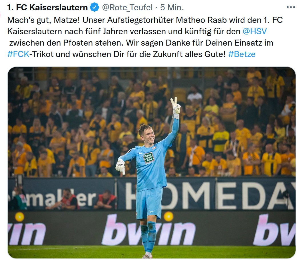 Der 1. FC Kaiserslautern hat Raabs Wechsel zum Hamburger Sportverein indes bestätigt. "Mach's gut, Matze! Unser Aufstiegstorhüter Matheo Raab wird den 1. FC Kaiserslautern nach fünf Jahren verlassen und künftig für den HSV zwischen den Pfosten stehen. Wir sagen Danke für Deinen Einsatz im FCK-Trikot und wünschen Dir für die Zukunft alles Gute!", schreibt der Verein auf seinen eigenen social media Kanälen.
