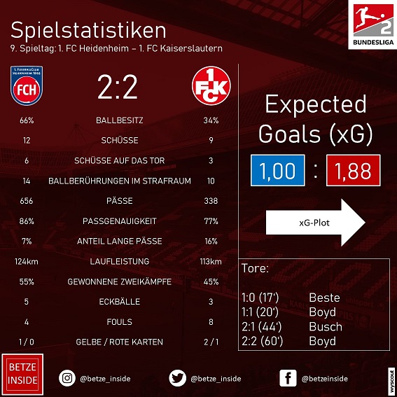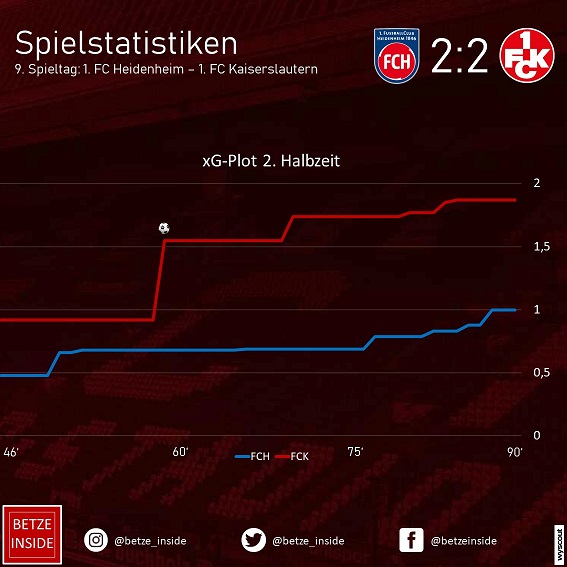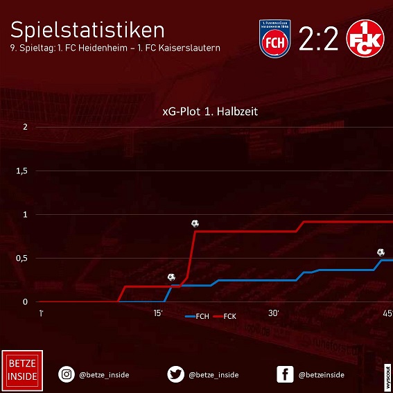 Die Statistiken (Abb. 1.) zeigen eine bessere Heidenheimer Mannschaft, die es jedoch nicht geschafft hat, die entscheidenen Torraumszenen zu nutzen. Besonders am xG-Plot (Abb. 2, 3) wird deutlich, dass die Roten Teufel zwar etwas weniger, aber dafür die deutlichen größeren Gelegenheiten hatten als die Gastgeber. Demnach wäre sogar ein Auswärtssieg im Bereich des Möglichen gewesen.
