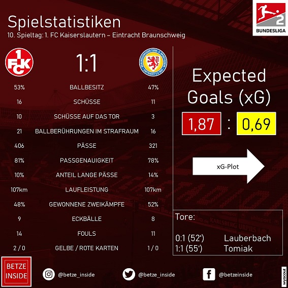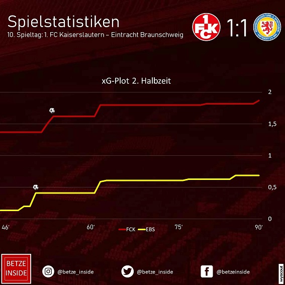 Statistisch betrachtet haben die Roten Teufel im Heimspiel gegen Braunschweig eher zwei Punkte verloren als einen gewonnen. Der FCK dominierte die Gäste aus Niedersachsen weitgehend und ließ bis auf das Gegentor kaum Chancen zu. Hinzu kamen eigene hochkarätige Großchancen (v.a. durch Boyd) und zwei Abschlüsse, die auf der Linie geklärt wurden. Der xG-Plot (Abb. 2, 3) zeigt, dass die Lautrer über die gesamte Spieldauer hinweg deutlich mehr Chancen zu verzeichnen hatten und bereits zur Pause hätten führen müssen. Allerdings blieb eine große Schlussoffensive aus, sodass der Sieg nicht erzwungen werden konnte.