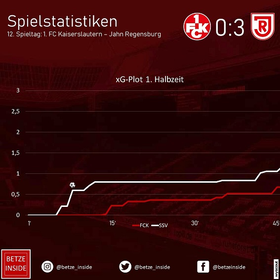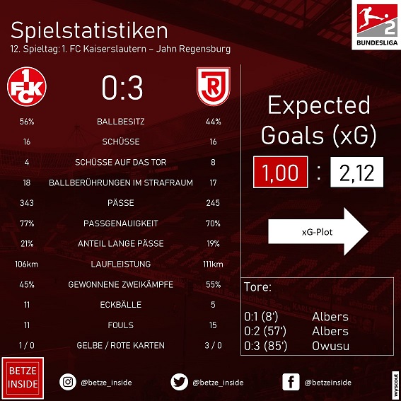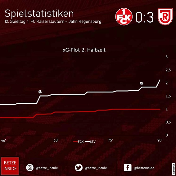 Gegen Regensburg zeigte der FCK in dieser Spielzeit erstmals eine enttäuschende Vorstellung. Bei den Statistiken stechen vor allem die geringe Laufdistanz von nur 106 gelaufenen Kilometern und die lediglich zu 45 Prozent gewonnenen Zweikämpfe negativ heraus. Im bisherigen Saisonverlauf sind solche Werte eher untypisch für die Roten Teufel. Außerdem spricht es nicht für die spielerische Qualität des Auftritts, wenn in einer Partie, die man nach einem frühen Gegentor fast durchgehend selbst gestalten musste, mehr als jeden fünften Ball hoch und weit spielt.