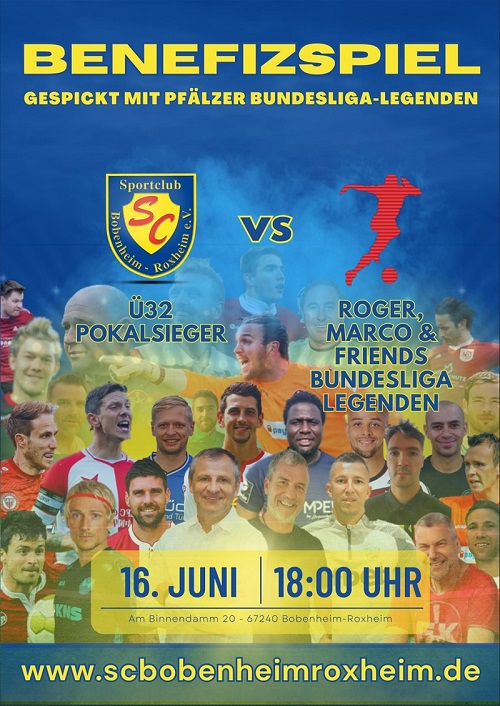 Es wird ein Zusammenkommen der ganz besonderen Art. Über zehn Jahre ist es nun her, dass der Betzenberg zuletzt Bundesliga-Oberhaus-Luft schnupperte. Damals noch mit Trainer Marco Kurz, der bei diesem Benefizspiel ebenfalls dabei sein wird. Heute, viele Jahre später treffen sich einige Weggefährten von damals wieder, um gemeinsam für die gute Sache zu kicken. Im Rahmen des dreitägigen Vereinsfestes des SC Bobenheim-Roxheim wird der Sportclub gegen eine Mannschaft antreten, die mit ehemaligen Bundesligaspielern, Nationalspielern, DFB-Pokalsiegern und Deutschen Fußballmeistern aus der Pfalz gespickt ist. Der gesamte Erlös des Benefizspiels wird für gemeinnützige Zwecke gespendet, u.a. an den Sozialverein Kunterbunt (www.sozialverein-kunterbunt.de) und an den Förderverein Fußball SC Bobenheim-Roxheim (www.foerderverein-boro.de).