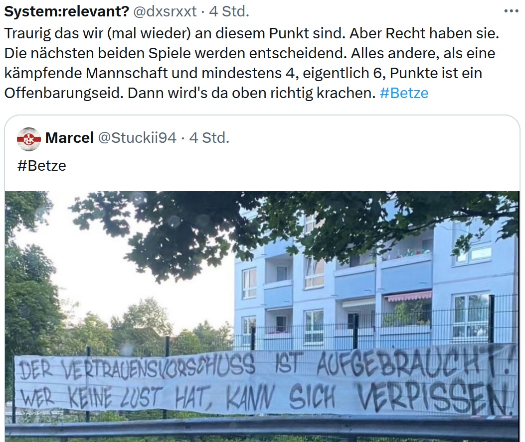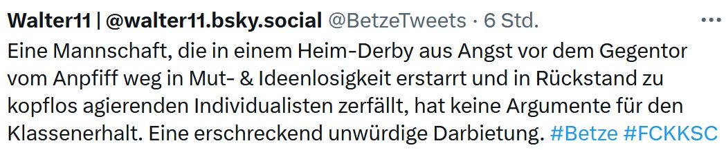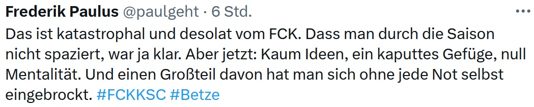 "Wir haben einfach einen Riesenhaufen Scheiße abgeliefert und es tut mir für jeden leid, der dafür Geld bezahlt. Was wir heute abgeliefert haben, war einfach eine bodenlose Frechheit." Selten hat ein Fußballer deutlichere Worte gefunden. FCK-Torhüter Julian Krahl war nach der historischen 0:4-Niederlage im Südwestderby sichtlich bedient. Bereits ab der 80. Minute verließen zahlreiche Fans das Fritz-Walter-Stadion, andere wiederum warteten bis zum Schlusspfiff, um sich dem gellenden Pfeifkonzert anzuschließen. Einige wenige betraten den Innenraum und stellten die Mannschaft zur Rede. Und die Fans im Netz? Die hatten auch einiges zu sagen. Wir haben an dieser Stelle einige Netzreaktionen festgehalten.