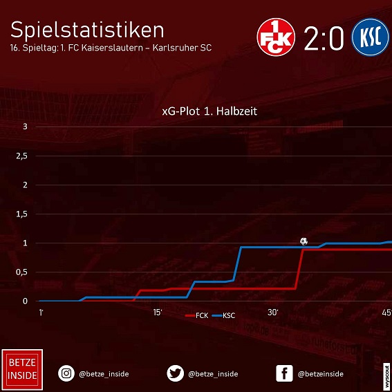 In dieser Phase des Spiels konnten sich die Hausherren hinten raus kaum befreien. Zu wenig Präzision im Passspiel, viele verlorene Bälle und fehlende Anspielstationen sorgten dafür, dass der KSC den Druck auf das Lautrer Tor zunehmend erhöhen konnte. Die Führung erzielten jedoch trotzdem aus dem Nichts die Roten Teufel. Philipp Hercher und Marlon Ritter sorgten für die Vorbereitung und Terrence Boyd mit seinem achten Treffer für die Führung gegen den Sportclub. Die Karlsruher hatten mehr vom Spiel und die besseren Torchancen, der FCK wiederum die nötige Effektivität vor dem Tor. Eine insgesamt mehr als glückliche Pausenführung.